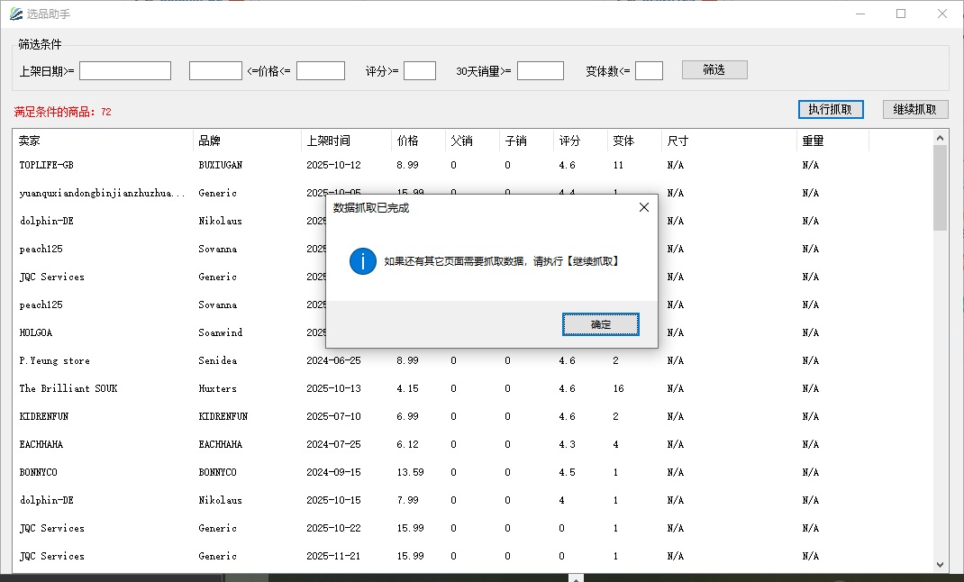 选品助手,能够读取网站的数据,生成表格,并提供过滤条件,快速筛选出您满意的商品,如图2,图3